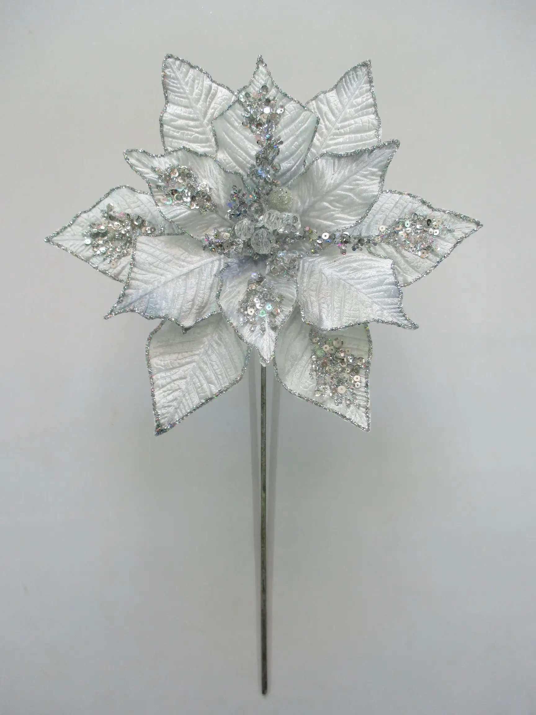 Our flowers feature a beautiful array of unique picks complete with contrasting pieces like this striking green and silver poinsettia pick. The bright rich green petals have an icy silver decor allowing the beautiful textures to stand out. Create a picturesque environment by filling your trees, wreaths, and garlands with this captivating piece.