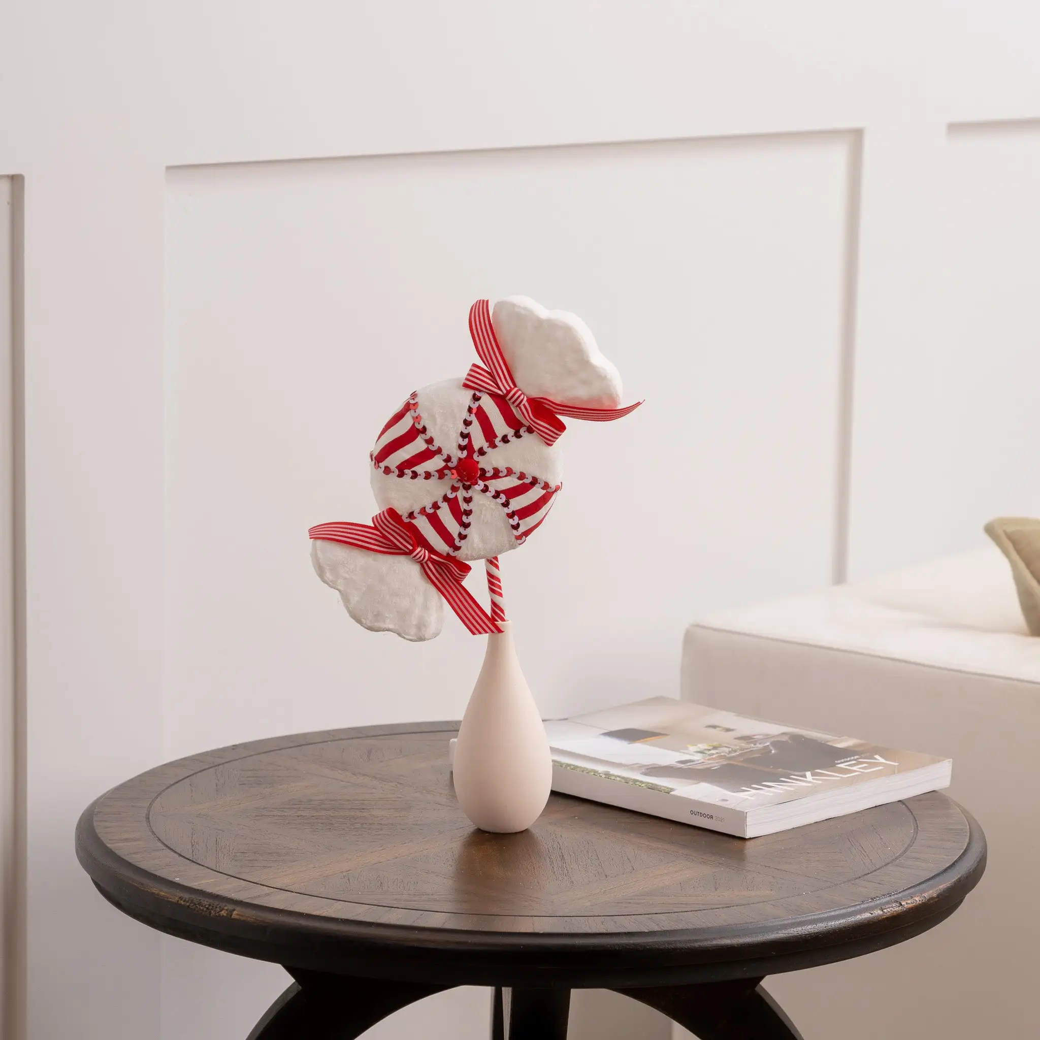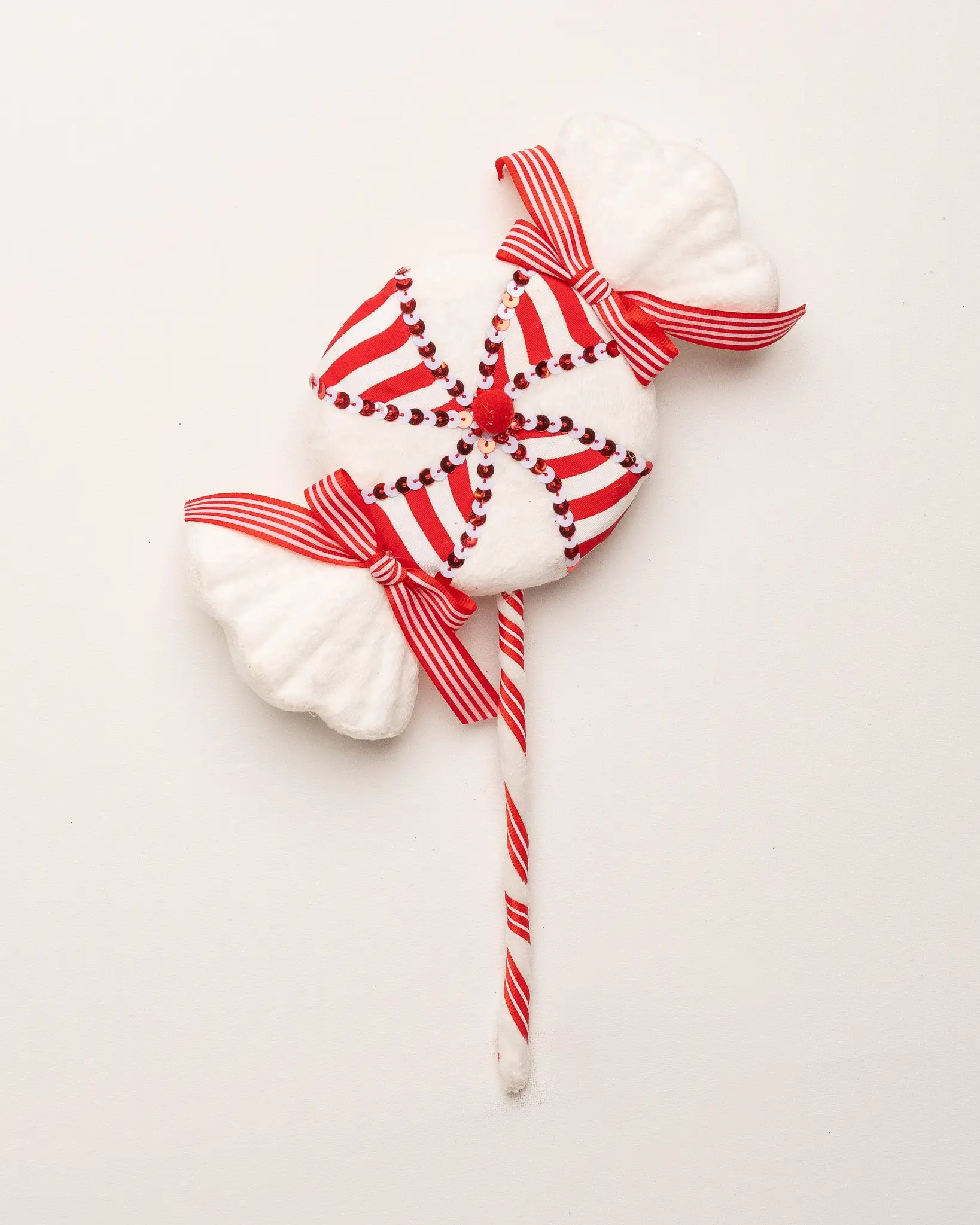 Much bigger than the candies that go in a Christmas stocking, this peppermint swirl candy pick can last for the entire Christmas season! Red polka dots line the peppermint swirls of this lollipop pick, and a cute candy stripe ribbon is tied around the wrapper ends to add to its charm. This would be so fun as an oversized accent to sweets and candy themed Christmas displays, or maybe even stick one in a vase of faux poinsettias or on your Christmas tree!