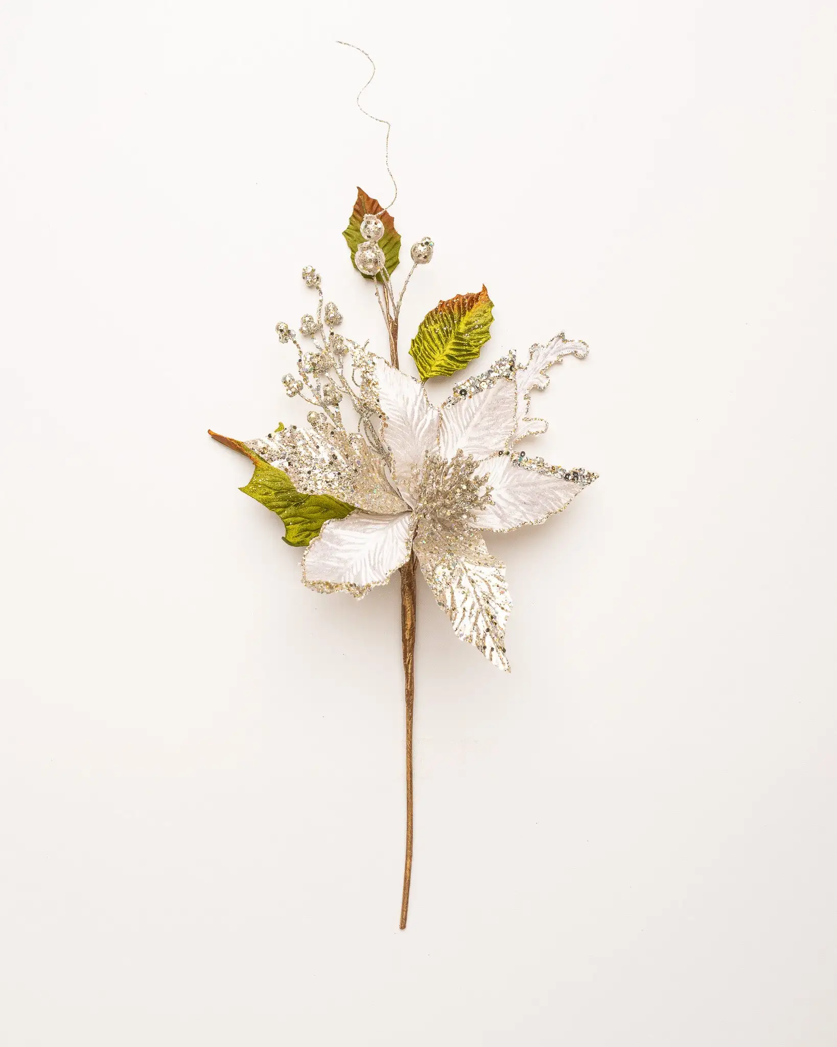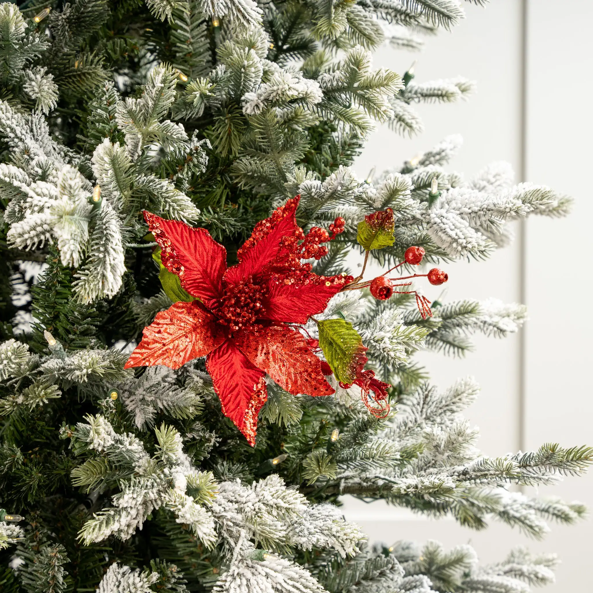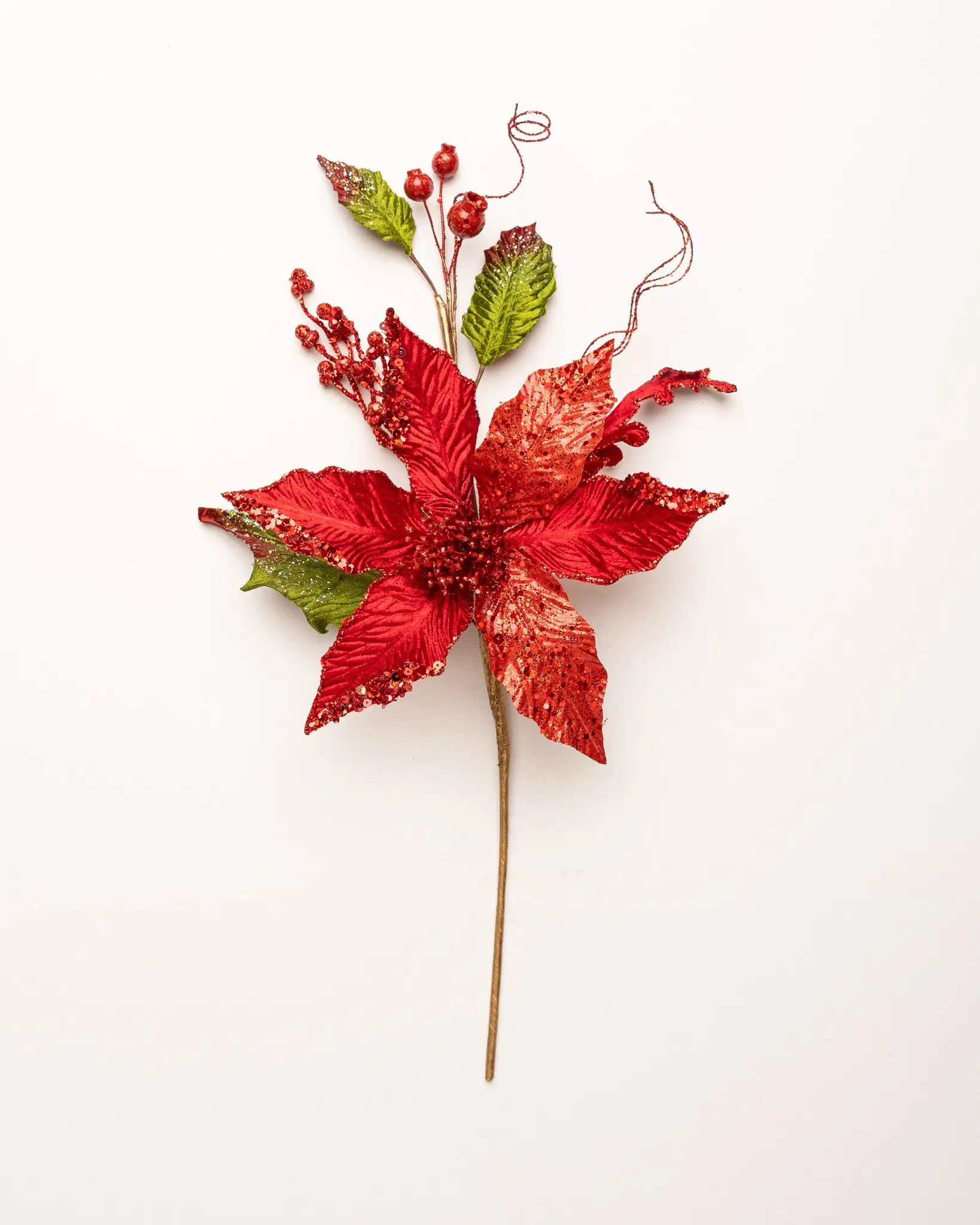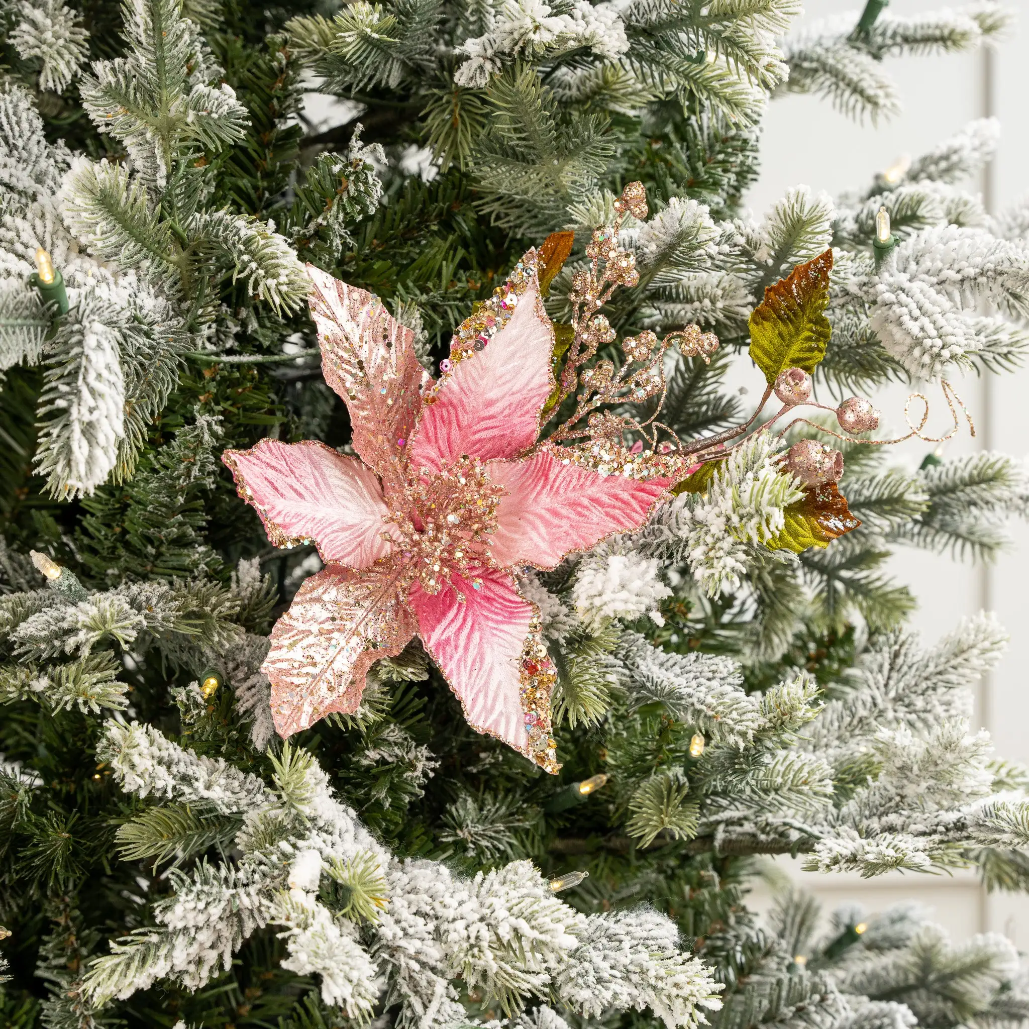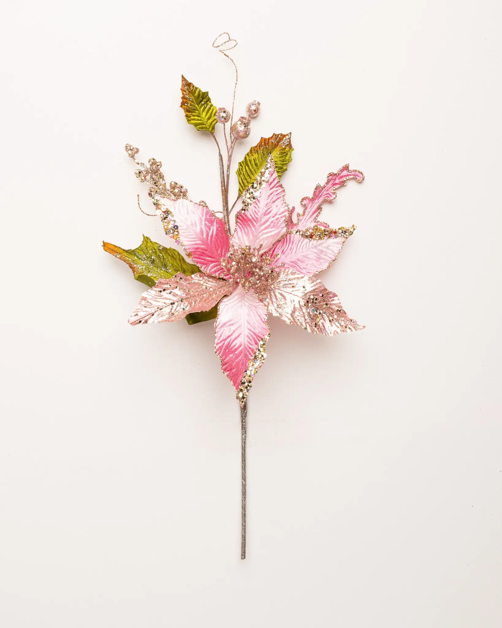 Luxe and dramatic, our pink poinsettia with leaves sets the stage for a vivid display. The combination of soft velvet and glittery embellishments will enhance the elegant feel of your decor, perfectly.