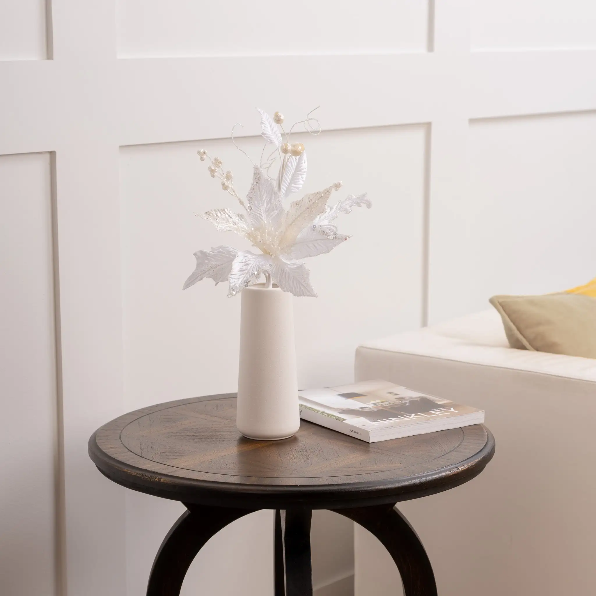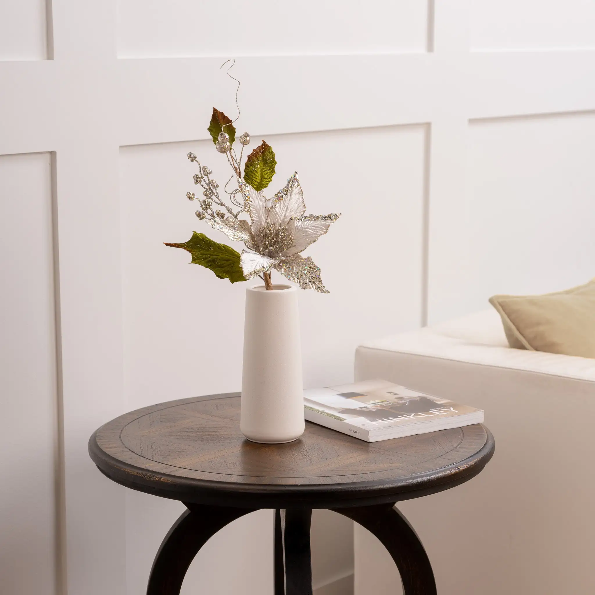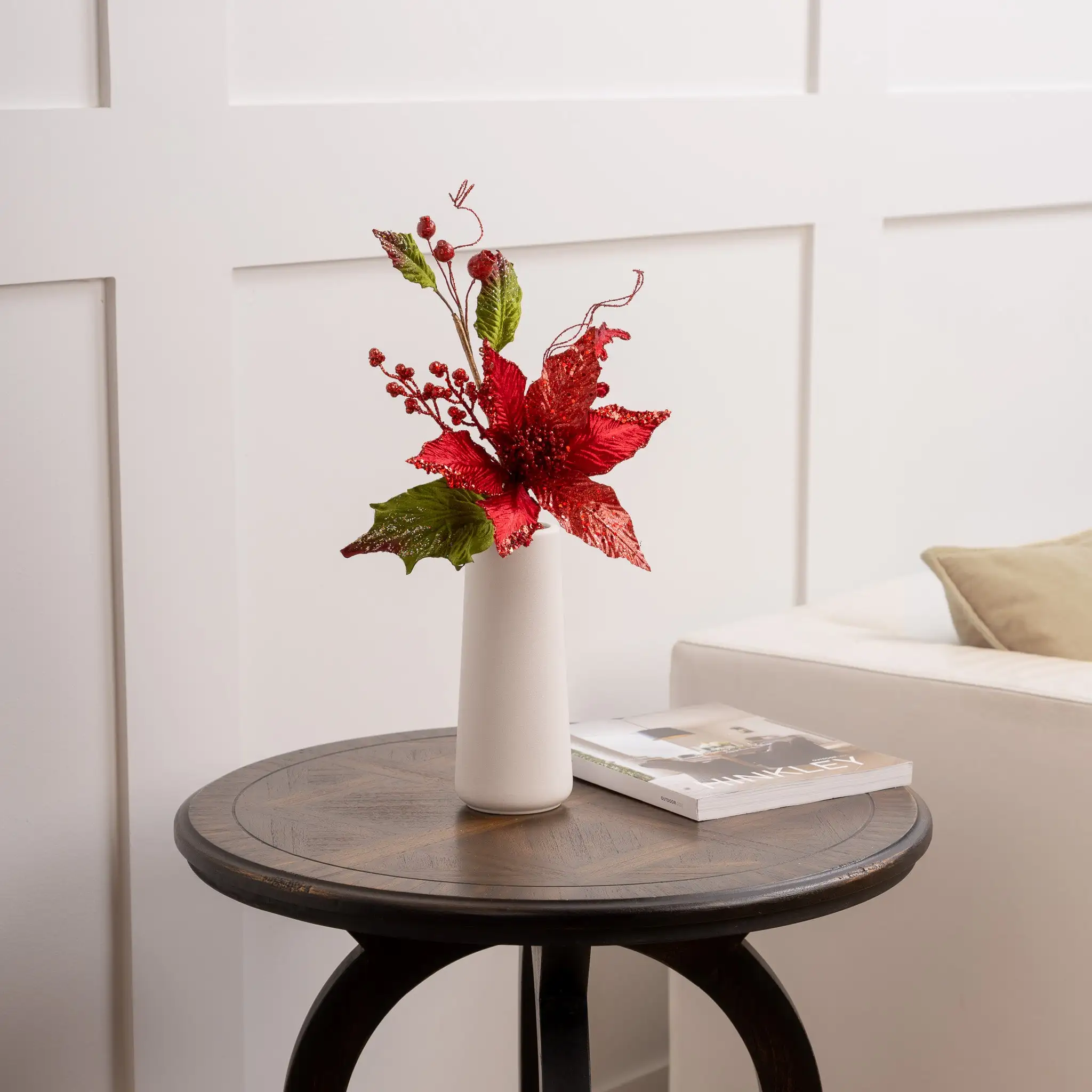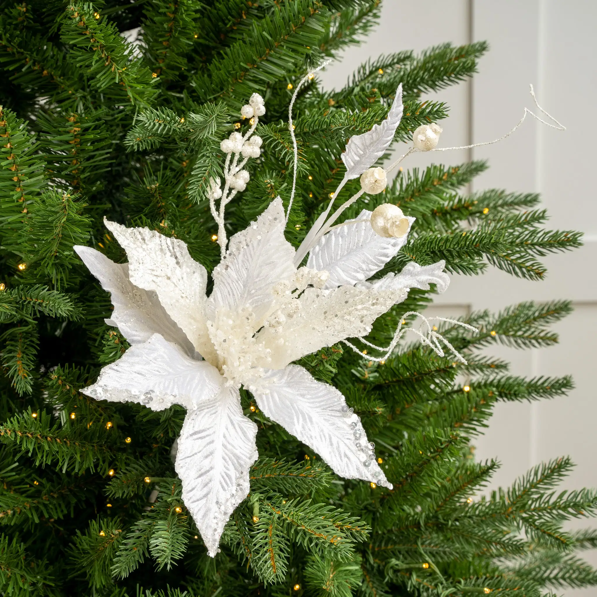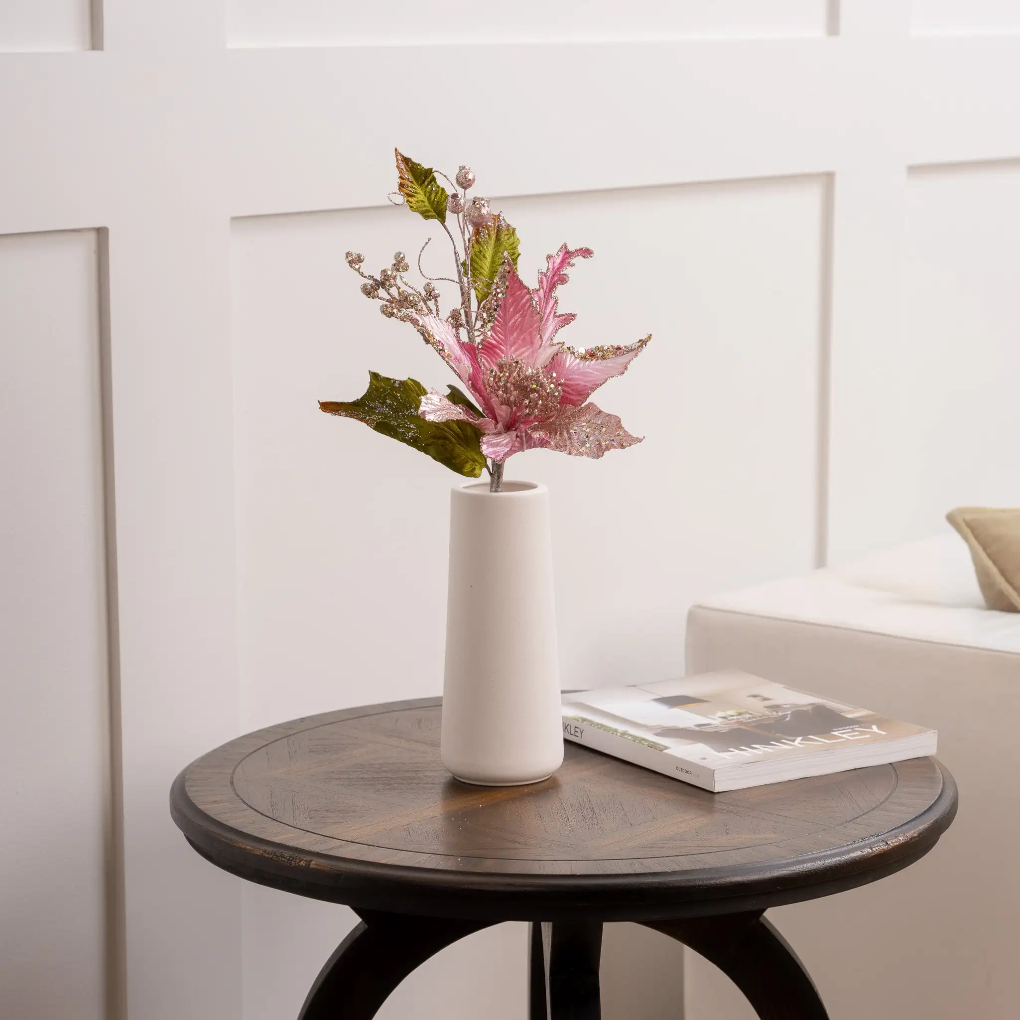 Luxe and dramatic, our pink poinsettia with leaves sets the stage for a vivid display. The combination of soft velvet and glittery embellishments will enhance the elegant feel of your decor, perfectly.