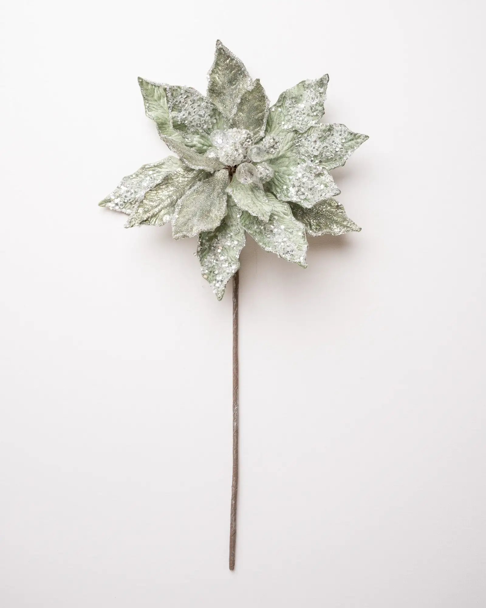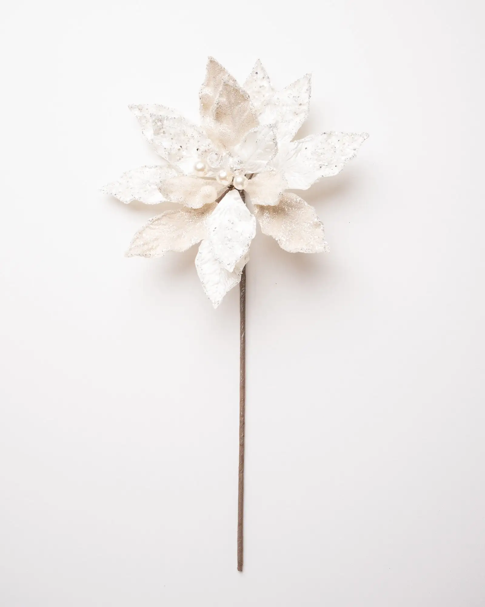Our flowers feature a beautiful array of unique stems complete with contrasting pieces like this striking icy poinsettia stem. Create a picturesque environment by filling your trees, wreaths, and garlands with this captivating piece.