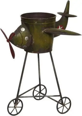 Fly away with me through the clouds on this fun retro airplane planter box display! Reminiscent of a childs riding toy, such as a radio flyer plane, it looks like a toy, but it’s really a fun display. Standing tall on metal legs and wheels, this vintage look plane has charm and a nostalgic feel to it. Looking like a tin toy of yesteryear, this beautiful plane will capture your heart and imagination. Boys and girls of all ages will enjoy looking at this wonderful piece of decor. So whether you are, or have, a little Amelia Earhart or Howard Hughes, capture the magic of the golden age of movies, such as “Wings,” in this amazing piece of aeronatical memorabilia!