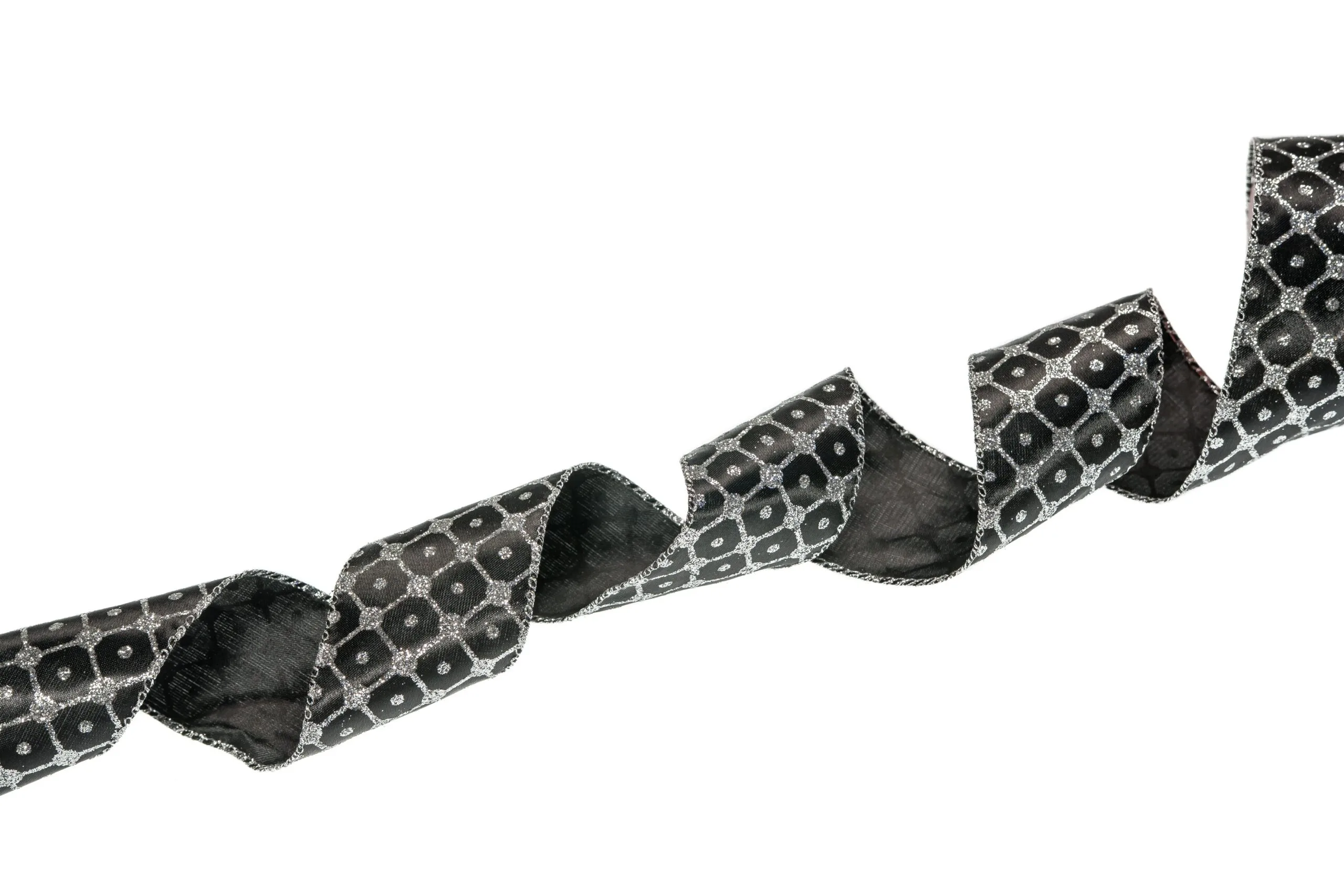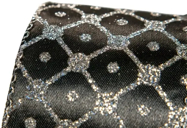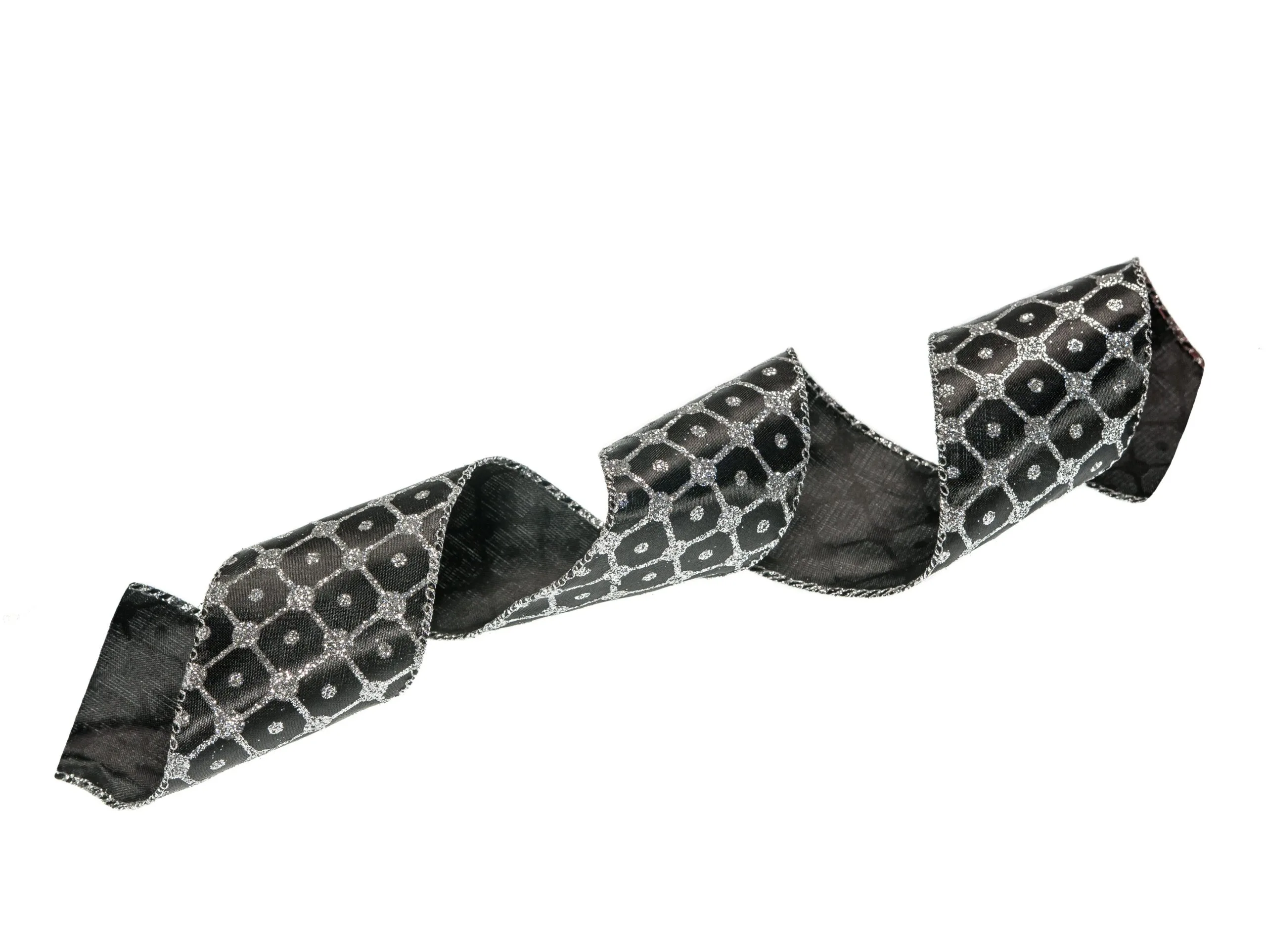 Add this unique yet elegant black and silver ribbon to your holiday decor this season. It features thin silver glittered sqaures with a accent dot in the middle. It measures 2.5″ in width and is also available in 4″ width.