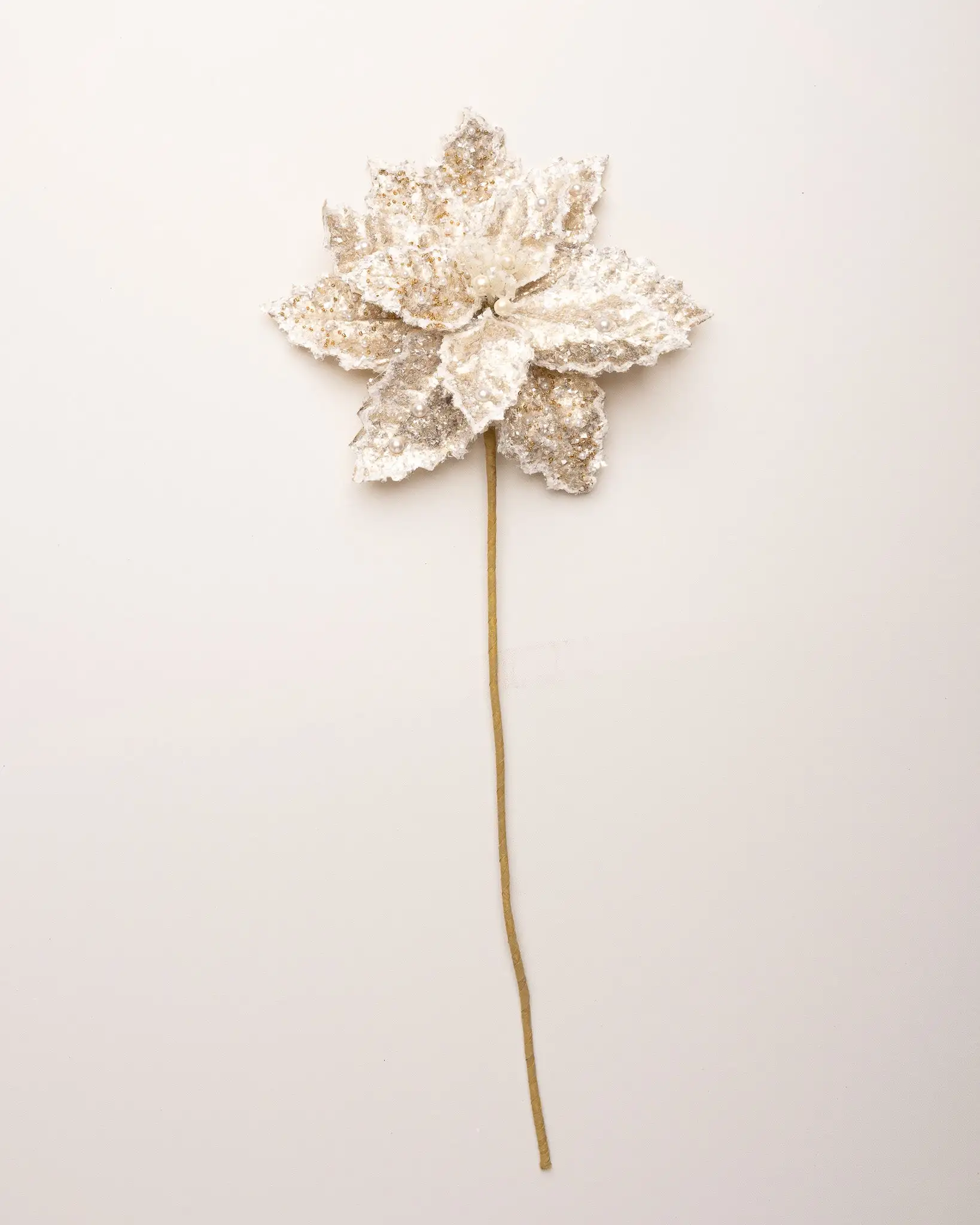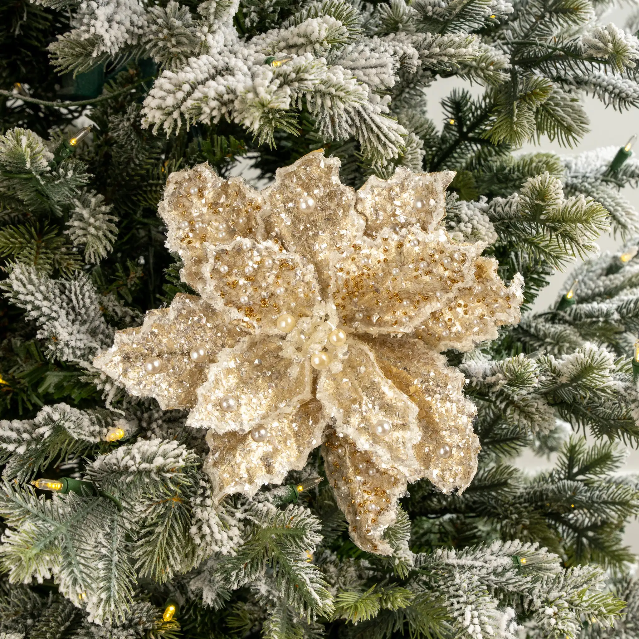 Take classy to a whole new level with this bright metallic poinsettia. It goes seamlessly with any decor theme. It features a champagned color along with faux ice crystals and it comes together with a pearled center.