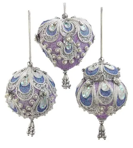 Be dazzled this holiday season with this exquisite set of 3 ornaments! Featuring a heart ornament, ball ornament, and finial ornament with varying shades of blue and silver for maximum glitz and glam, this set will add a special sparkle to your holiday decor.