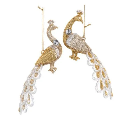 Adorn your tree with these dazzling 3.5″ peacock ornaments, crafted from luxe gold and platinum glitter. Tastefully finished with beautiful resin for a regal finish. Add elegant style to your holiday decorations!