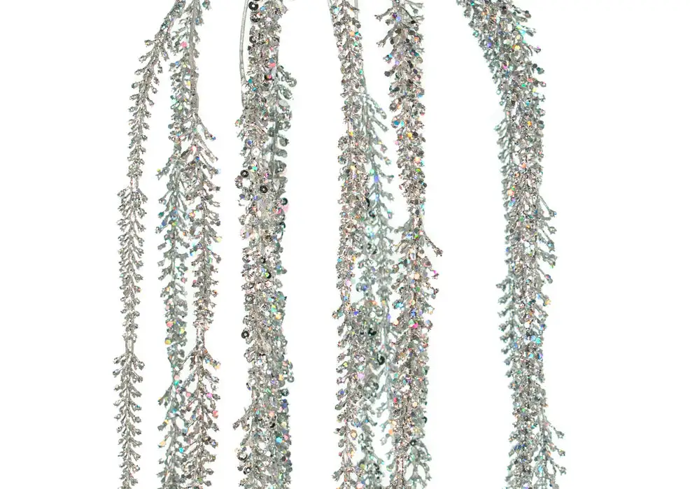 This glitter hanging branch is unique, Featuring cascading branches in clusters covered in silver glitter and sequences. Imagine how lovely this would look placed in a vase by your entry way. Buy a few sprays to create a full and plush look.