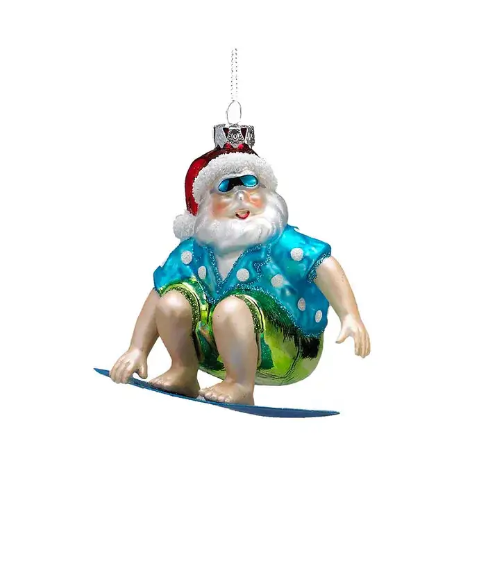 This glass beach Santa ornament is the perfect decoration for anyone who longs for the lazy days of summer during the holiday season. Santa Claus is featured here in his summer gear (and classic red and white hat, of course) hanging onto a blue surfboard.