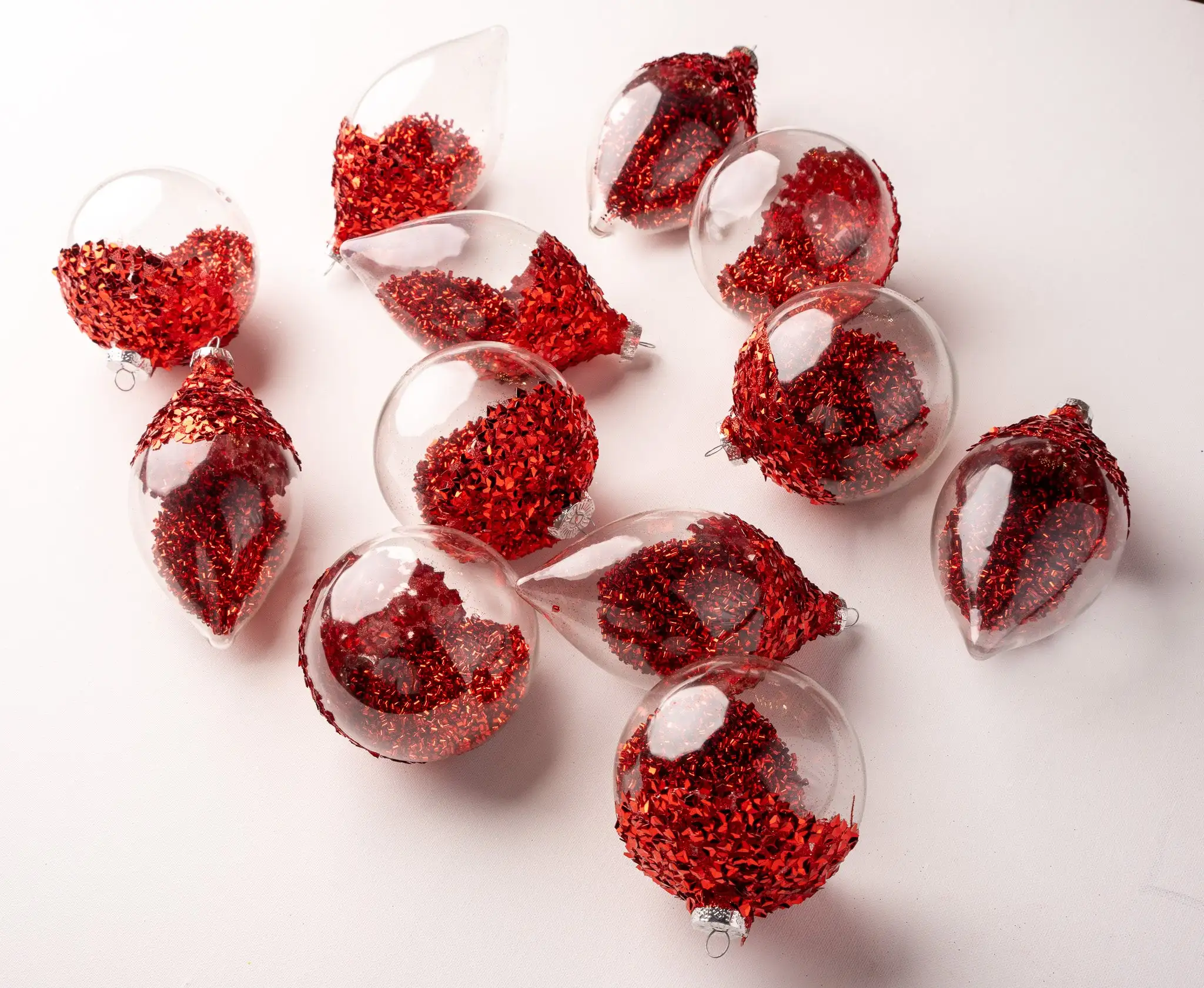 Give your holiday decor a cool touch of elegance and vintage flair with this beautiful set of clear glass ornaments topped with red glitter and filled with red tinsel beads. These ornaments are designed with various finishes and styles and will add unique bling to your trees, wreaths, and centerpieces.