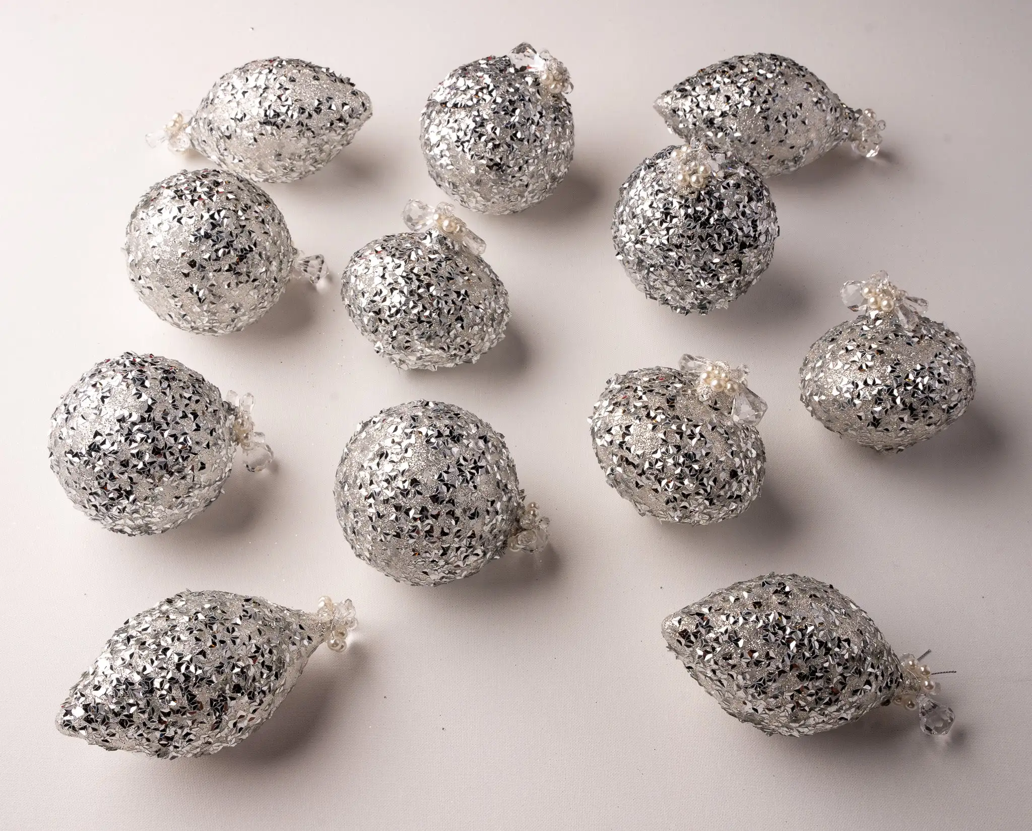 This beautiful assorted set of glass ornaments are covered in glitter that will catch light in the most delightful way all season long.