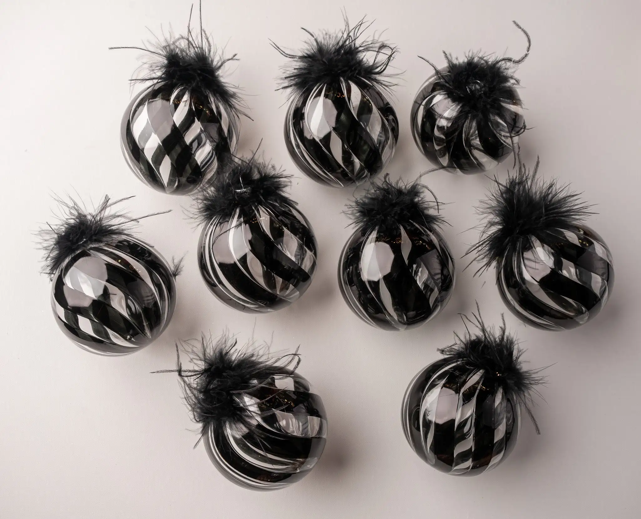 Delight in timeless elegance with this set of 9 glass ornaments featuring black feather accents and a classic black strip design. Each piece adds depth and sophistication to any decor, making them the perfect addition to your holiday display. Festive and stylish, this set is sure to bring joy and wonder to your home!