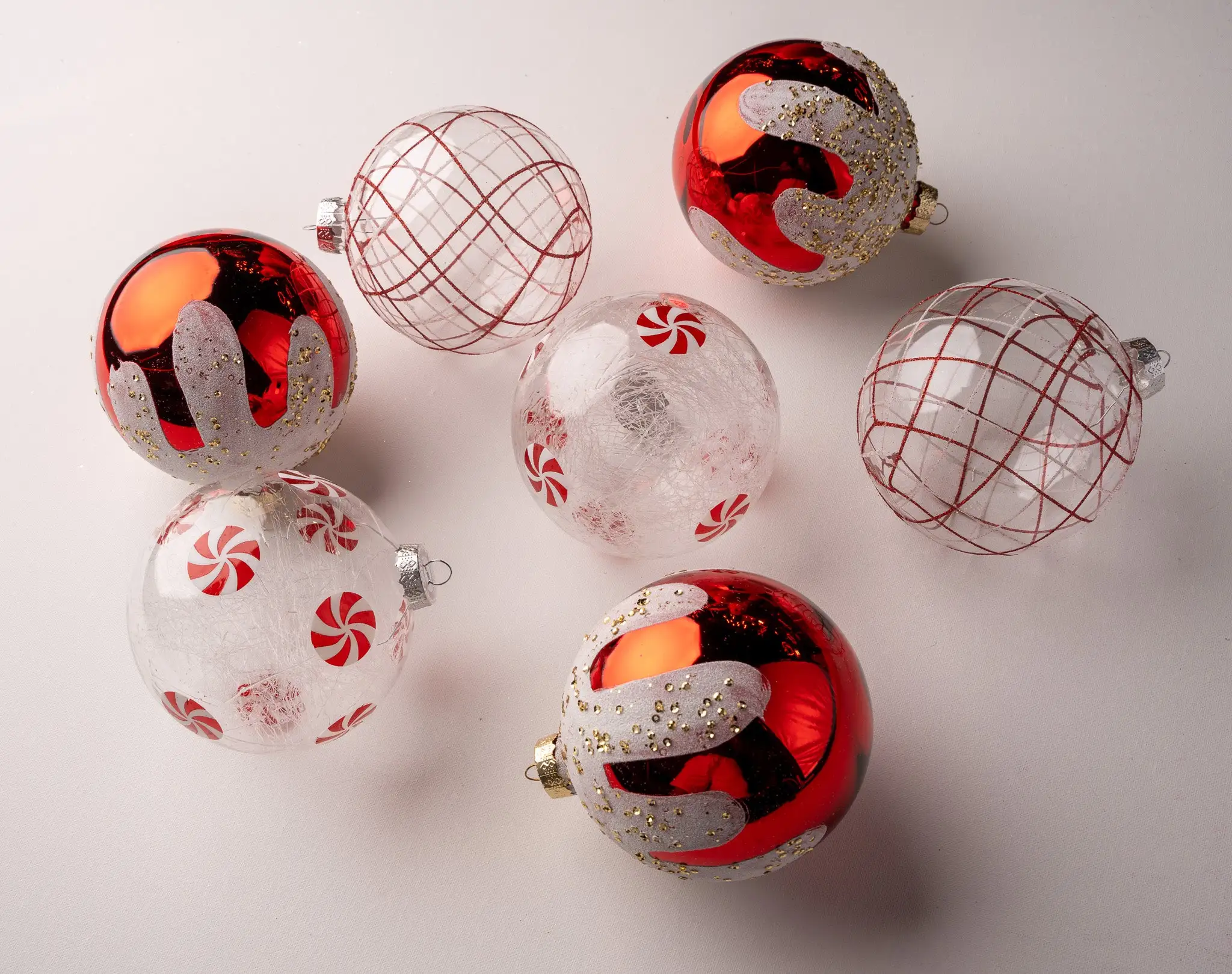 These 5″ glass ornaments are the perfect way to add holiday cheer to your home. With a clear glass finish these unique decorations come in three different styles including red & sequin balls, as well as peppermint glass spun designs. Give your tree an enchanting, festive look!