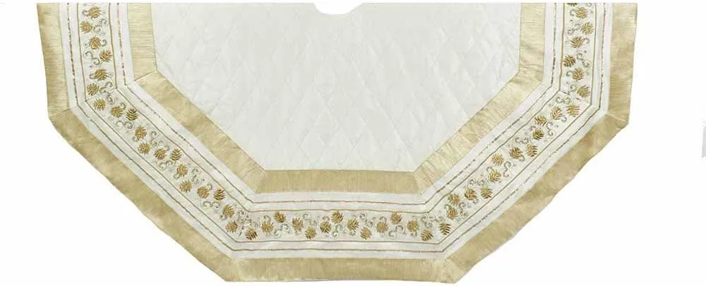 This 54-inch Ivory Tree Skirt with Gold Pinecones is a beautiful, festive way to complete the décor of your Christmas tree. Its 54-inch eight-sided design is ivory in color and features thick gold borders and a delicate gold pinecone print in between the borders.