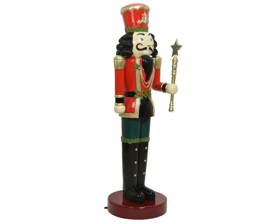 This 6.5′ polyresin nutcracker is a perfect addition to your holiday decor. Its bright red and green color scheme and large display make it an impressive seasonal decoration for any home. Crafted from durable polyresin, it adds a lasting, festive touch.