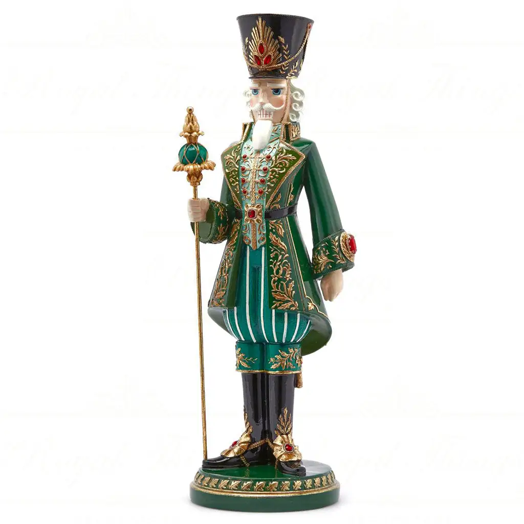 Surround yourself with timeless beauty with this vibrant Green Baroque Nutcracker. Featuring a green and blue baroque motif, a soldier holding his staff, and golden accents, this classic piece will bring a luxurious touch to your holiday décor. Let it bring festive cheer and timeless style to your home!