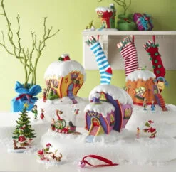 We all know the moment the Grinch decided to steal Christmas, when he needed the costume, the sleigh, and the reindeer! His trusted friend Max stepped up and became his reindeer! This figure shows the Grinch in his copycat Santa costume tying an antler onto Max’s head with red yarn! This will be the perfect piece to add to your Grinch village!