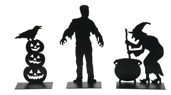 What do the monster, the witch and the pile of pumpkins have in common? They are all matte black metal silhouettes ready to place on the front lawn of any of your Halloween Village houses. They are the Spooky Silhouettes.