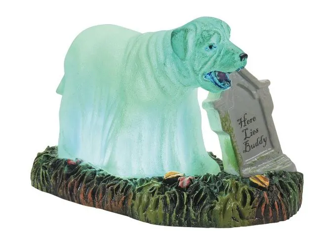Buddy has gone to a better place, to the R.I.P. Cemetery , of course. This lighted accessory features Buddy as a pet ghost ready to haunt the neighborhood.