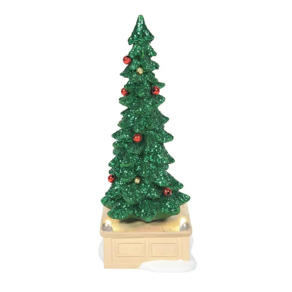 Standing almost 9 inches tall, the “Town Center Tree” is a showstopper. The glittered tree rotates on a handsome base that holds 4 uplights that make the tree shimmer and shine.